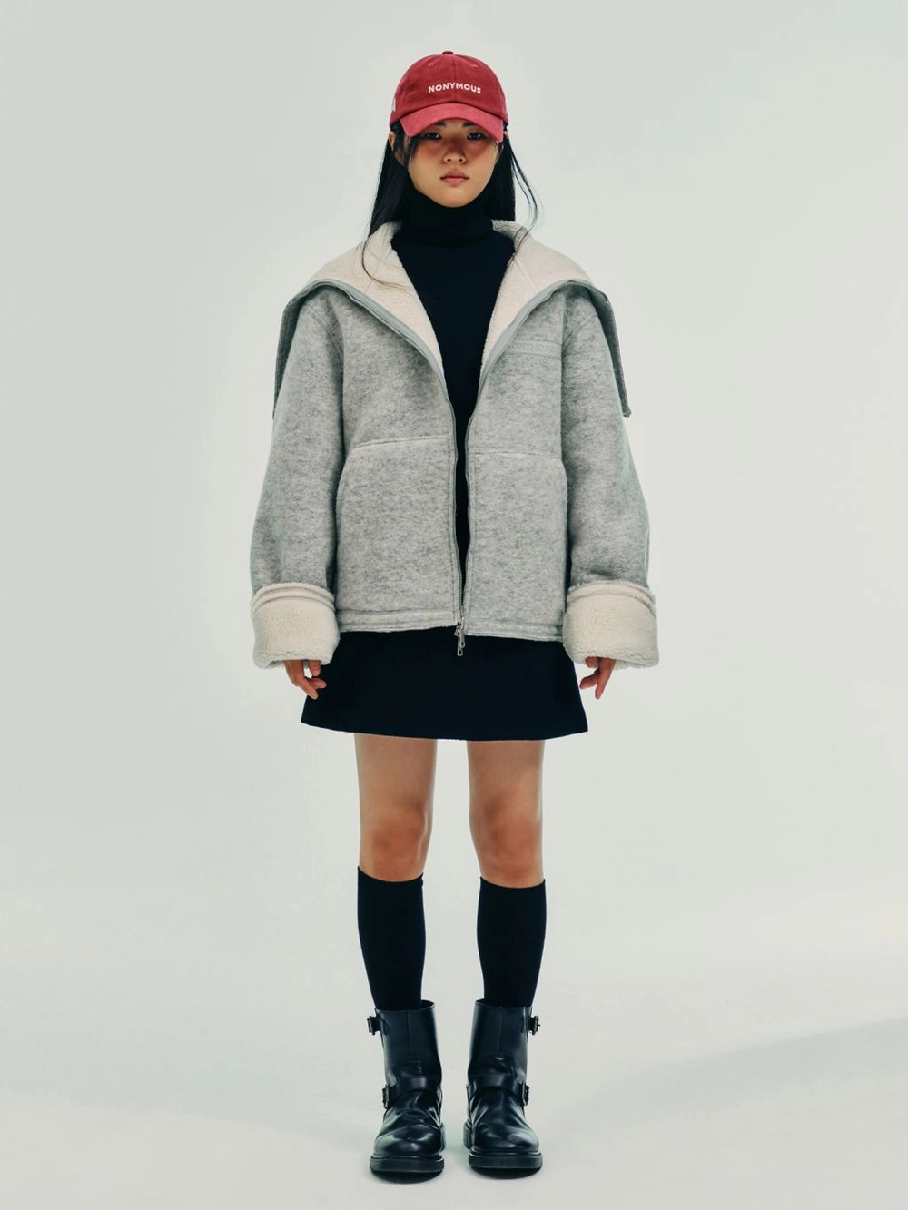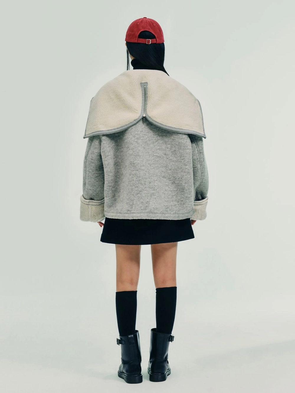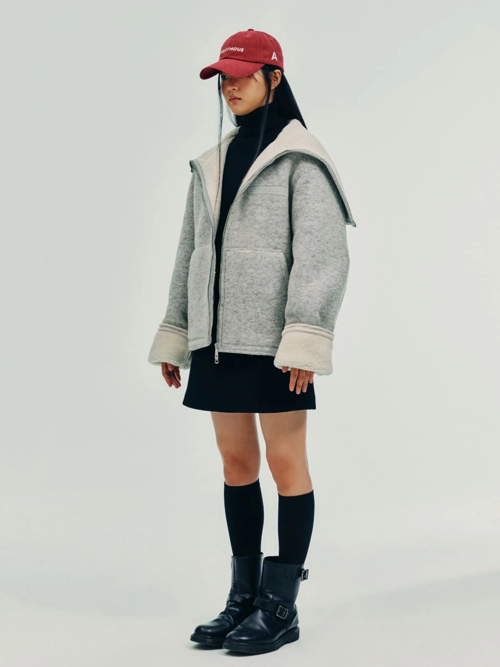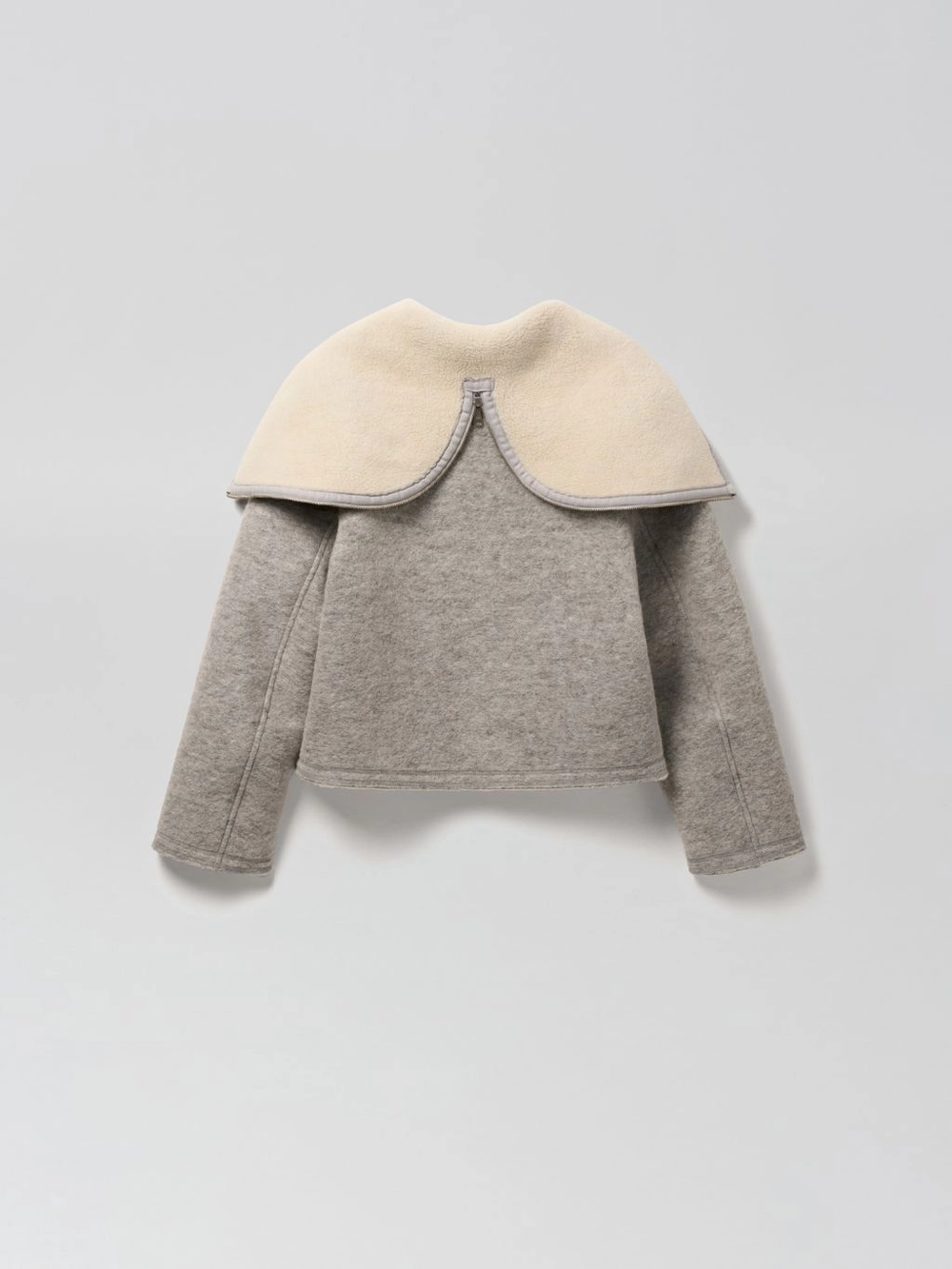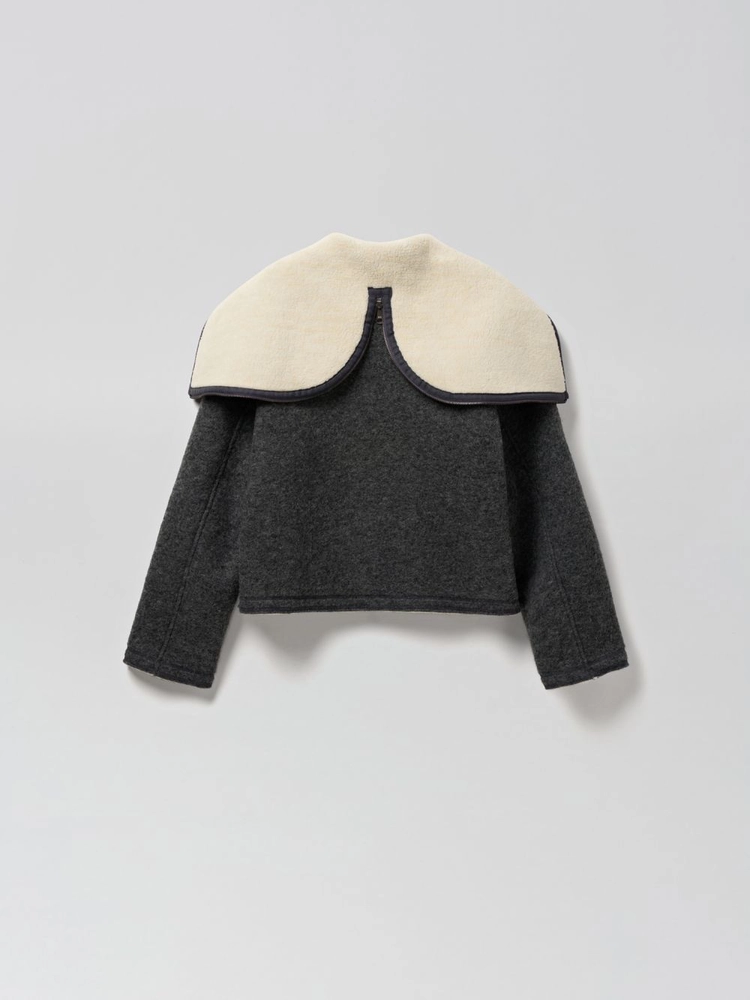소매단과 밑단을 커팅으로 마감, 울 이중 원단의 텍스쳐를 살림